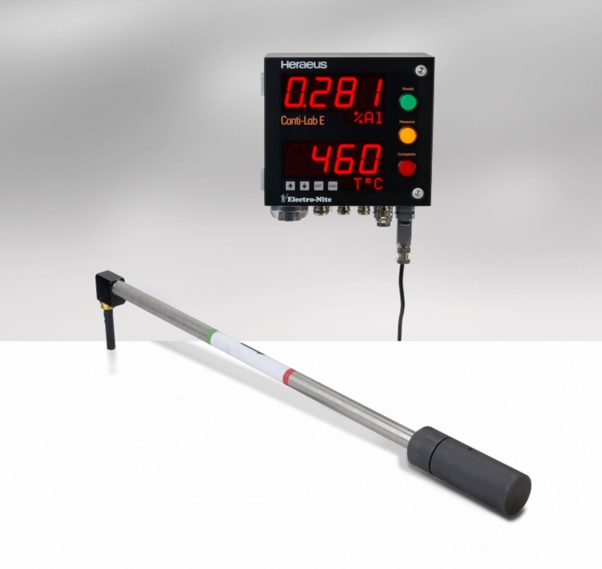 AlZin continuously monitors the effective aluminium content and pot temperature in zinc coating baths. Using an electrochemical cell built into a rigid immersion probe, aluminium concentrations over a range from 0 -1.000% may be measured with an accuracy matching ICP analysis. A typical service life of an AlZin sensor is 2 weeks. An iron calculation program is available using AlZinlog-E software.
