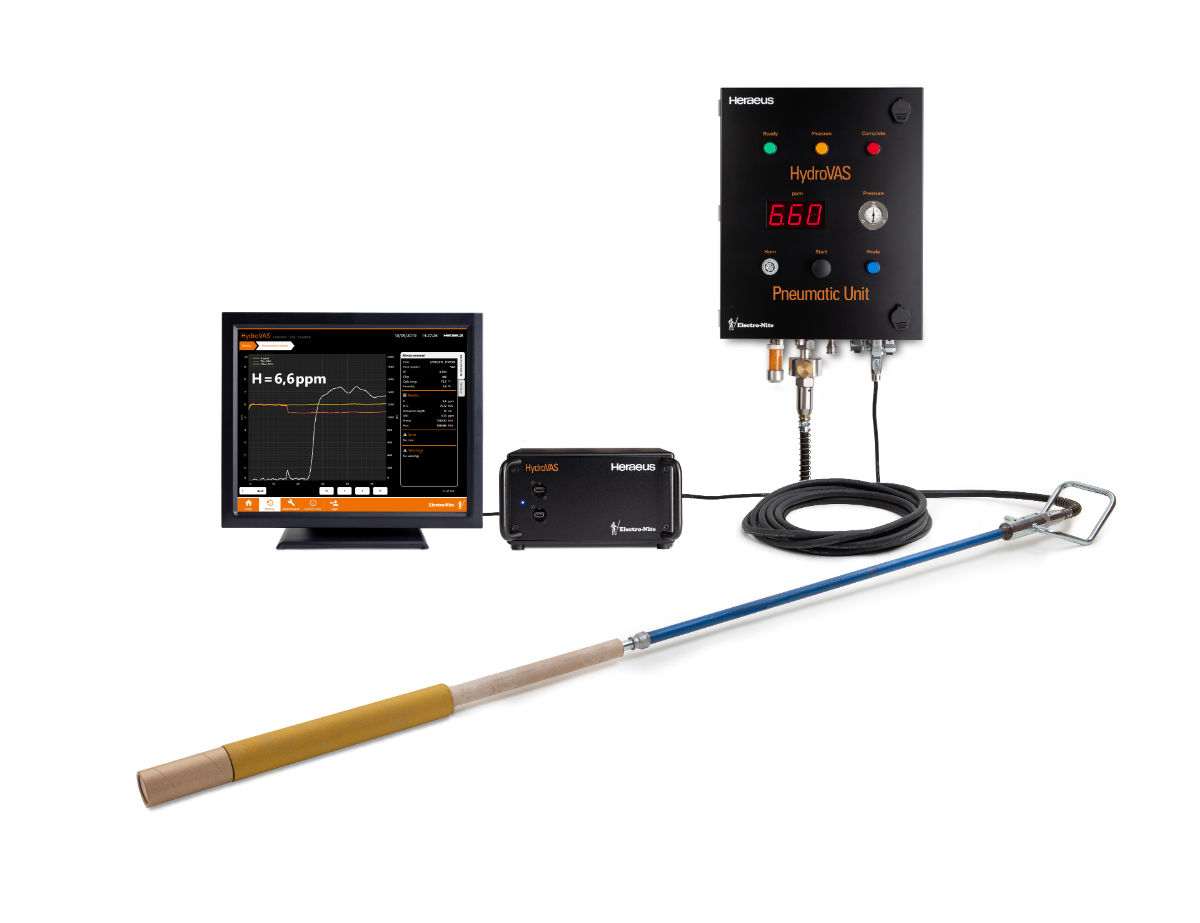 HydroVAS®(水素真空分析システム)は、溶融物中の溶液濃度と安定した均衡状態に到達するオープン系システムを利用します。また、特殊な鋼種での測定も可能です。 HydroVAS®空圧ユニットは、HydroVAS®空圧ランスや付属のHydroVAS®プローブを介してキャリアガスを鋼溶融物中に送ります。